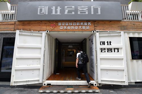 一名咨詢者走入位于北京海淀區(qū)中關(guān)村創(chuàng)業(yè)大街的創(chuàng)業(yè)會客廳。 鞠煥宗 攝