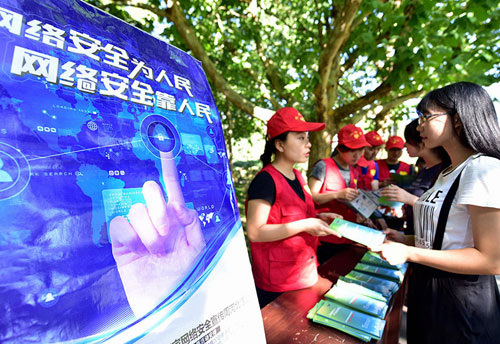 河北省廊坊市安次區網信辦工作人員和志愿者向學生們發放網絡安全宣傳折頁,倡導廣大師生提高網絡安全意識,共同維護網絡社會秩序(2017年9月19日攝)。新華社記者 王曉 攝