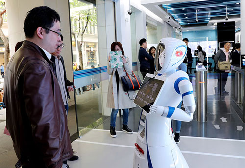 一位市民在位于上海九江路的無人銀行入口處向迎賓機器人說明需要辦理的業務種類(4月12日攝)。近日,中國建設銀行在上海九江路開出國內首家無人銀行。新華社記者 方喆 攝