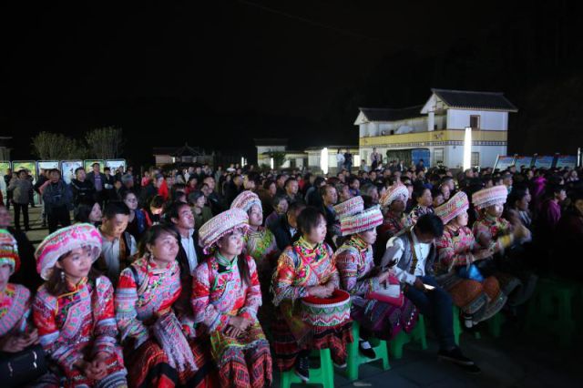 ↑毛村村民正在觀看露天電影《十八洞村》。