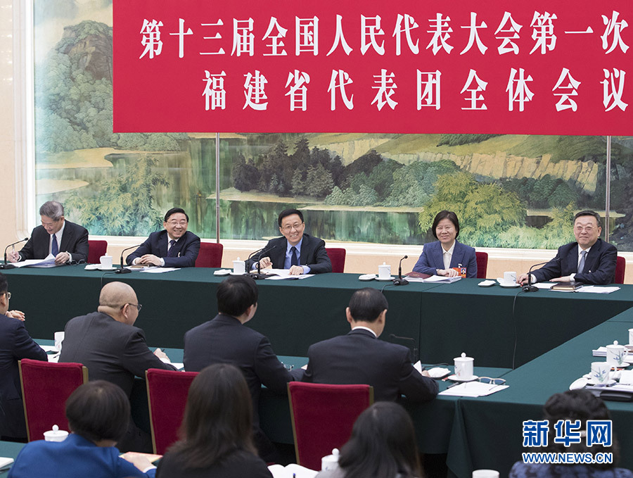 韓正在福建代表團參加審議。在聽取于偉國、唐登杰、章聯生等代表發言后,韓正指出,福建在我國改革開放中具有重要地位,要深入學習貫徹習近平新時代中國特色社會主義思想和黨的十九大精神,在學懂弄通做實上下功夫。牢固樹立、不斷增強“四個意識”,堅決維護以習近平同志為核心的黨中央權威和集中統一領導。落實好習近平總書記對福建工作的重要指示精神,激發體制機制活力,切實加快科學發展跨越發展;加快產業結構優化升級,著力推動高質量發展;堅持以人民為中心,切實保障和改善民生;建設美好生態環境,守住守好綠水青山;切實把全面從嚴治黨落到實處,確保黨的領導更加堅強有力,奮力建設“機制活、產業優、百姓富、生態美”新福建。